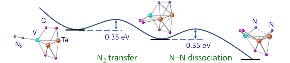 氮气分子活化在氮还原反应(NRR)中至关重要。我们用密度泛函理论计算研究了N2在三金属阴离子团簇V(3-x)Ta(x)C4–(x = 0-3)上的活化反应机理。三个金属原子使得N2具有更好的配位方式,有利于N-N键解离。研究发现,N2在团簇上的活化需要经历转移和解离两个过程,在异核团簇VTa2C4–上,N2转移和解离过程都具有较低的能垒,因此可以作为理想的催化活性中心用于催化剂设计。